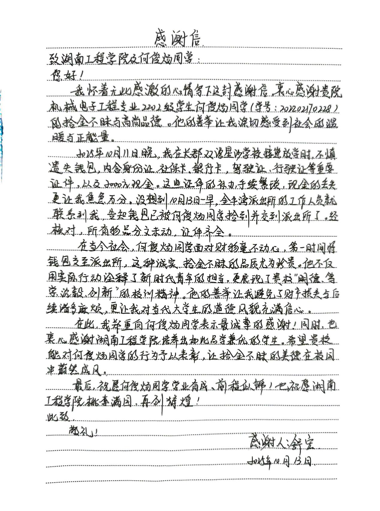 近日,william威廉亚洲官方学生工作办公室收到两面锦旗与一封感谢信,致谢机械电子工程2202班何俊炀同学的拾金不昧之举,也为学校立德树人的扎实成果“点赞”。