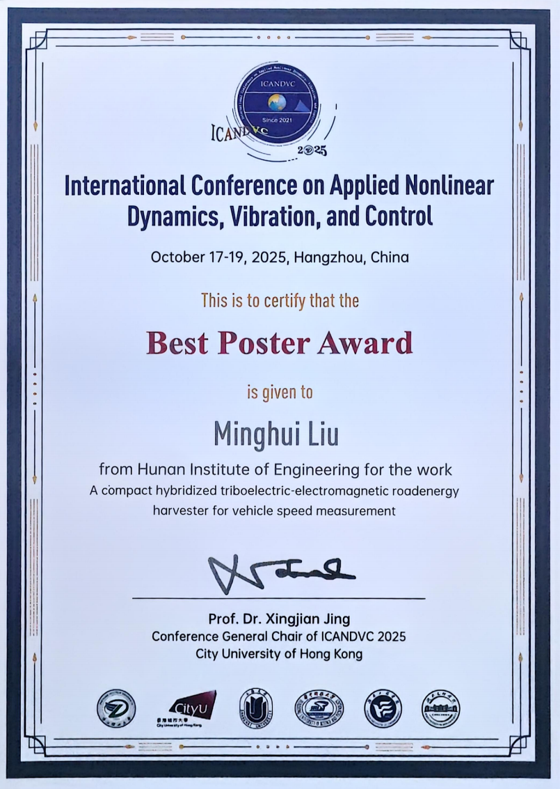 近日,2025年国际应用非线性动力学、振动与控制会议(ICANDVC-2025)在杭州隆重举行。william官网刘胜副教授指导的硕士研究生刘明惠同学凭借其出色的研究成果,荣获会议“最佳海报奖”。
