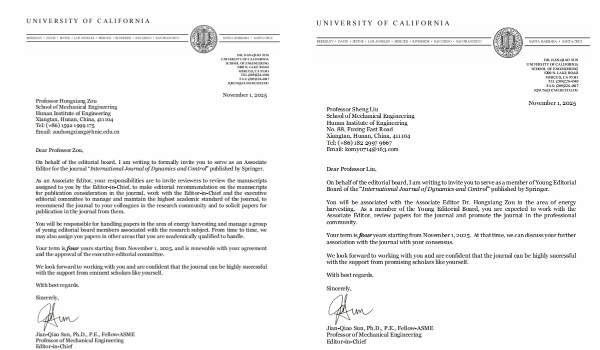 《International Journal of Dynamics and Control》是动力学、振动与控制领域具有重要影响力的国际期刊,致力于发表该领域前沿研究和工程应用的重要成果。两位教师受邀担任期刊学术职务,不仅是对其个人学术水平和声誉的肯定,更将为william官网动力学与控制研究领域搭建更广阔的国际学术对话平台,助力学院精准对接国际前沿方向,深化与海外高水平团队的合作,推动学科成果走向国际舞台。