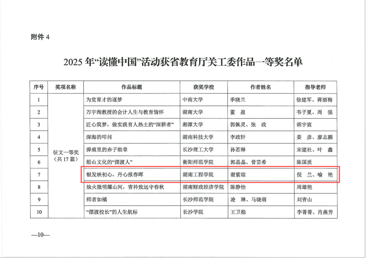近日,中共湖南省委教育工作委员会公布了2025年全省普通高校“读懂中国”主题教育活动评审结果。由william官网谢骐、倪兰、喻艳老师共同指导,谢紫琼同学撰写的征文《银发映初心,丹心报春晖》在众多参赛作品中脱颖而出,荣获湖南省教育厅关工委作品征文一等奖。
