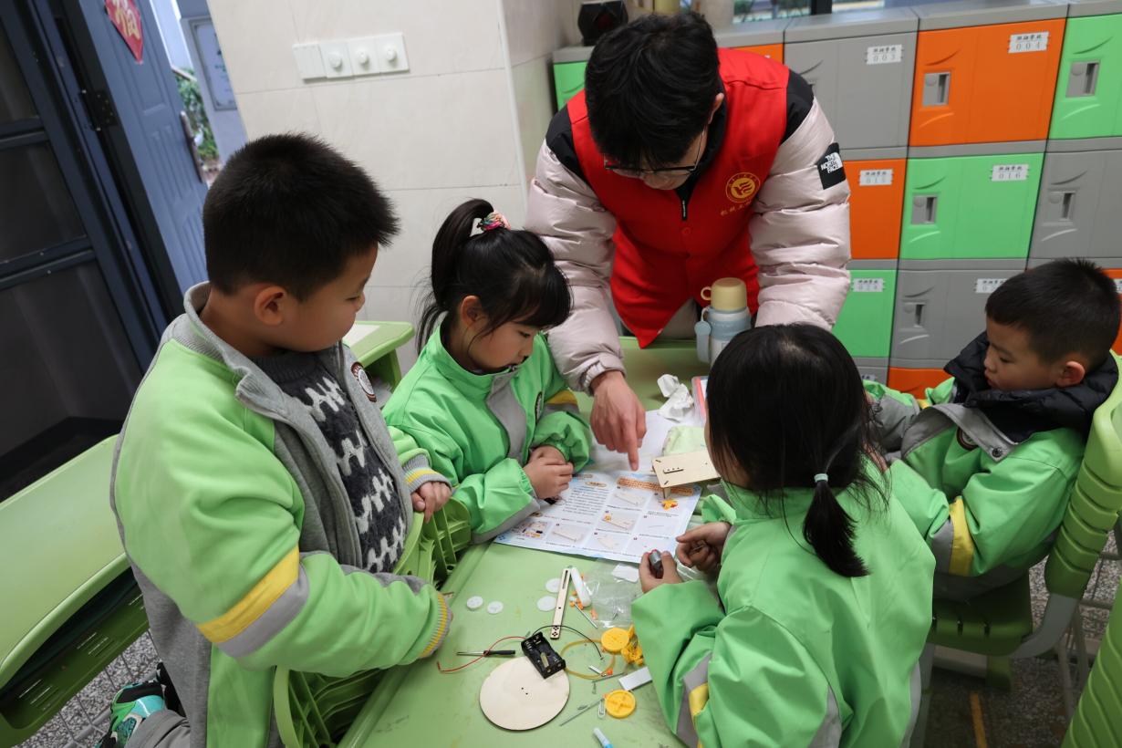 践行“绿色成长”理念,活动将动手实践与劳动教育结合,伴随着“咔嚓咔嚓”的零件组装声,机械拼装赛火热展开。志愿者们将课堂变身为“工程实验室”,带领孩子们分组合作完成简易机械模型拼装,让他们利用废矿泉水瓶搭建机械模型,在协作中理解“绿色设计”的可持续理念“这是齿轮传动装置,能让风车转起来哦!”志愿者一边演示一边讲解基础机械原理。一年级学生陈玥在组装完太阳能小车后兴奋地说:“我长大后要造出真正的环保汽车!”